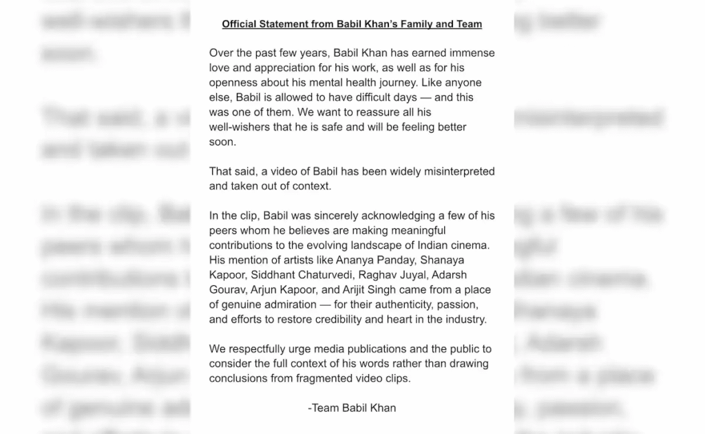 बयान में कहा गया, “पिछले कुछ वर्षों में, बाबिल खान ने अपने काम के साथ-साथ अपने मानसिक स्वास्थ्य के बारे में खुलकर बात करने के लिए अपार प्यार और प्रशंसा अर्जित की है। किसी भी अन्य व्यक्ति की तरह, बाबिल को भी मुश्किल दिनों से गुजरना पड़ता है – और यह उनमें से एक था। हम उनके सभी शुभचिंतकों को आश्वस्त करना चाहते हैं कि वह सुरक्षित हैं और जल्द ही बेहतर महसूस करेंगे।” इसमें आगे लिखा है, “क्लिप में, बाबिल अपने कुछ साथियों को ईमानदारी से स्वीकार कर रहे थे, जिनके बारे में उनका मानना है कि वे भारतीय सिनेमा के विकसित परिदृश्य में सार्थक योगदान दे रहे हैं। अनन्या पांडे, शनाया कपूर, सिद्धांत चतुर्वेदी, राघव जुयाल, आदर्श गौरव, अर्जुन कपूर और अरिजीत सिंह जैसे कलाकारों का उनका उल्लेख वास्तविक प्रशंसा के स्थान से आया – उनकी प्रामाणिकता, जुनून और उद्योग में विश्वसनीयता और दिल को बहाल करने के प्रयासों के लिए।”