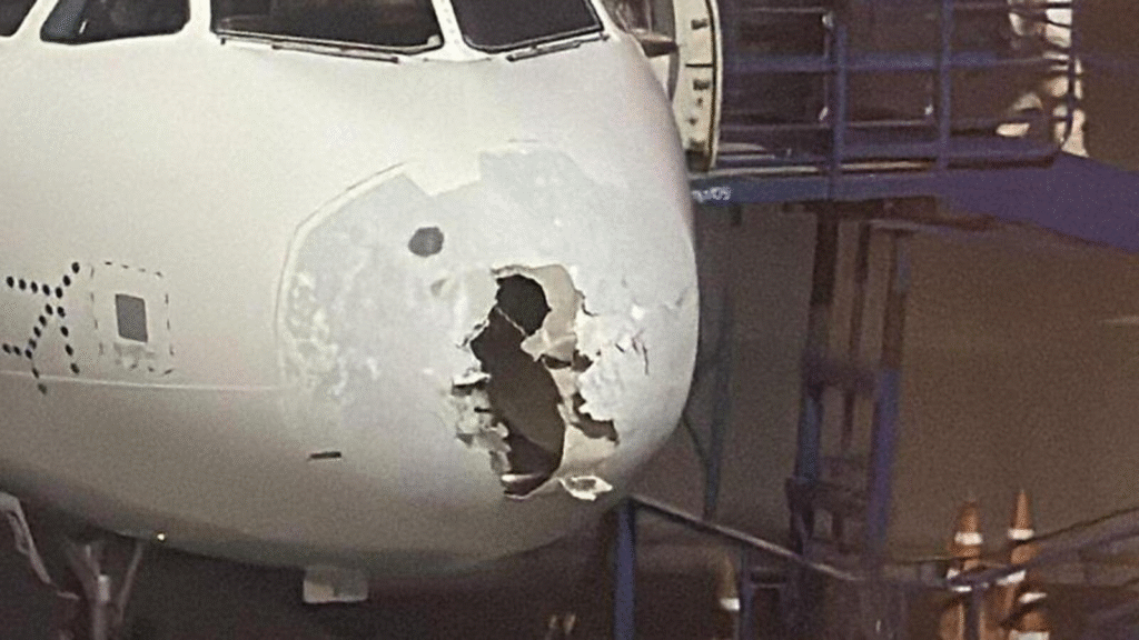 इंडिगो की फ्लाइट 6E2142 को श्रीनगर के पास पहुंचने के दौरान भयंकर ओलावृष्टि का सामना करना पड़ा, जिससे विमान के नोज़ कोन को नुकसान पहुंचा। विमान के उतरने के बाद सभी यात्रियों और चालक दल के सदस्यों को सुरक्षित बाहर निकाल लिया गया।